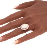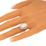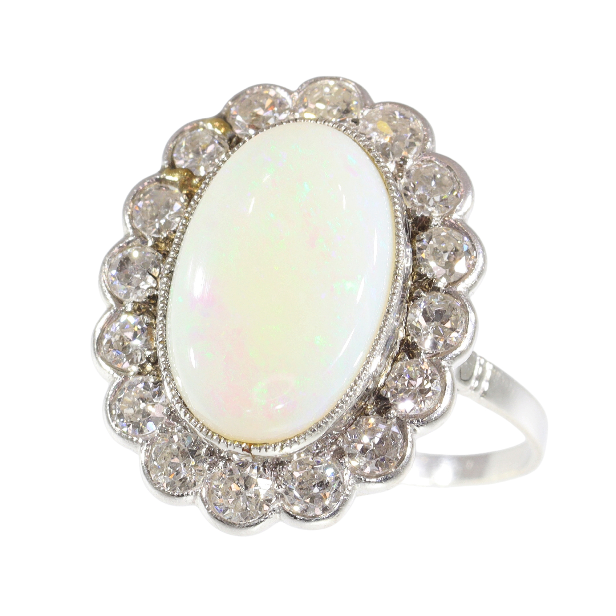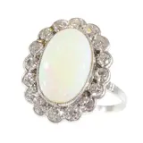 This exquisite vintage engagement ring from the 1950s, crafted in lustrous platinum, showcases a harmonious blend of opulence and elegance. It features a magnificent cabochon opal, weighing approximately 4.10 ct, ensconced amidst 16 old mine brilliant cut diamonds totaling around 1.12 ct. The ring embodies the era's transition towards more personalized and distinctive jewelry designs, combining the timeless allure of diamonds with the enchanting iridescence of opal. This piece is a testament to the romantic spirit of the time, offering a unique and sophisticated expression of love and commitment.