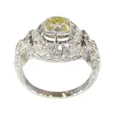 A burst of sunshine in platinum, this Edwardian-style ring centres on a vibrant fancy yellow diamond. Set within a delicate lacework of old-cut diamonds, the piece radiates early 20th-century elegance. Every detail, from the finely engraved shank to the openwork setting, speaks of grace and light. Created around 1920, it offers a joyful glow and enduring charm—the perfect beginning to an heirloom in the making.