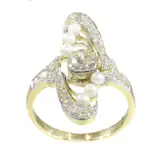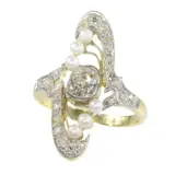 This turn-of-the-century Art Nouveau engagement ring, dating back to circa 1900, is an enchanting embodiment of style and romance. Its two-toned band harmoniously blends 18K yellow gold with white accents, highlighting one old European cut diamond, complemented by 22 old brilliant cuts and six orient saltwater seed pearls. The design showcases the era's signature whiplash curves and organic motifs, capturing the period's essence of integrating art into everyday life.