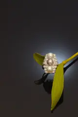 A quintessential statement piece from the Art Deco era, circa 1940, this engagement ring showcases a masterful blend of geometric elegance and sophisticated design. Crafted in lustrous platinum, it features 16 old mine brilliant cut diamonds, totalling approximately 0.88 carats, complemented by eight baguette cut diamonds, adding up to about 0.80 carats. Central to its charm are three cultured freshwater pearls, adding a touch of timeless grace. Reflecting the era's penchant for abstract motifs and functional glamour, this ring stands as a testament to love and the artistic innovation of its time. In very good condition, it encapsulates a period where the decorative arts reached a new zenith of modernity and sophistication.