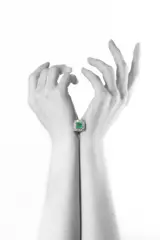 Crafted in the 1930s, this Art Deco ring exhibits a geometric elegance with its almost square shape and refined ajour detailing on the back, enhancing its allure. Featuring twelve old mine cut diamonds, collectively approximating 2.04ct, and a central emerald approximately 3.40ct, set in lustrous platinum. The meticulous craftsmanship and intricate details invite admiration, while the design embodies a cherished piece of history, reflecting the timeless allure of vintage jewellery.
