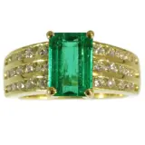 The marvellous natural emerald of this 18K yellow gold Estate ring by the Kutchinsky jewellery house could be a frozen 2.33crt. snippet from a green boreal lake, in which you wouldn't mind to plunge into. Even three shoulders, each with ten brilliant cut diamonds on every side of this verdant eye-catcher, have been prepared for you as springboards to dive right in.