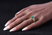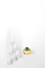 The marvellous natural emerald of this 18K yellow gold Estate ring by the Kutchinsky jewellery house could be a frozen 2.33crt. snippet from a green boreal lake, in which you wouldn't mind to plunge into. Even three shoulders, each with ten brilliant cut diamonds on every side of this verdant eye-catcher, have been prepared for you as springboards to dive right in.