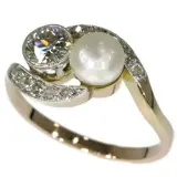 A quintessence of Belle Époque elegance, this 14K bi-colour gold 'toi et moi' ring from circa 1900 presents a harmonious alliance of an old European cut diamond with its counterpart, a lustrous pearl. Symbolising intertwined destinies, this piece is further embellished with a cascade of ten single cut diamonds set along the entwined shank. An exquisite Dutch creation, it embodies love and romance, a true celebration of the unity and fashion of its era.
