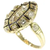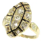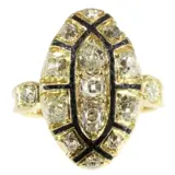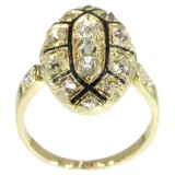 A resplendent Rococo ring, dating back to circa 1750, captures the whimsical grace of the late Baroque period. Crafted in 18K yellow gold, this piece showcases the era's penchant for asymmetry and ornate natural motifs, with 15 old brilliant cut diamonds totalling approximately 1.50ct. The enamelling technique employed is a testament to the artistry of the period, imbuing this exquisite ring with a colourful history, all preserved in excellent condition.