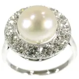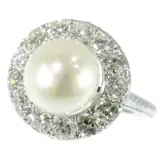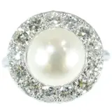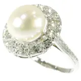 A splendid example of Art Deco craftsmanship, this platinum engagement ring from around 1930 harmoniously blends tradition and modernity. Thirteen old European cut diamonds form a radiant halo around a grand pearl, each gemstone contributing to the ring's overall luminescence. The intricate design features swirls that evoke a sense of joy and elegance, while the pearl's rainbow glaze adds a touch of mystique. Perfectly capturing the transition from Art Deco to the Interbellum period, this ring is a testament to the era's fascination with geometric forms and the enduring allure of fine jewellery.