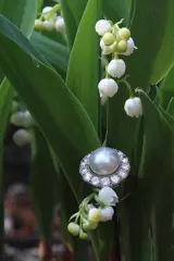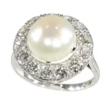A splendid example of Art Deco craftsmanship, this platinum engagement ring from around 1930 harmoniously blends tradition and modernity. Thirteen old European cut diamonds form a radiant halo around a grand pearl, each gemstone contributing to the ring's overall luminescence. The intricate design features swirls that evoke a sense of joy and elegance, while the pearl's rainbow glaze adds a touch of mystique. Perfectly capturing the transition from Art Deco to the Interbellum period, this ring is a testament to the era's fascination with geometric forms and the enduring allure of fine jewellery.