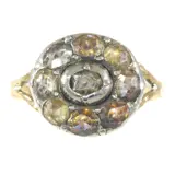 An exquisite example of Baroque artistry, this circa 1680 ring epitomizes the era's grandeur. Crafted in 14k pink gold and silver, it showcases nine white paste stones, artfully imitating diamonds in a traditional rose cut set on foil—a technique that enhances their brilliance. The ring's design reflects the Baroque ethos of dynamic curves, exuberant forms, and rich, symmetrical ornamentation, rooted in classical Renaissance style yet distinctly evolved. Its provenance remains a mystery, adding an aura of intrigue to its already captivating presence.
