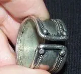 Deze open knijpring heeft een toegeknepen diameter van circa 20 mm. en is 11 mm. breed. Doordat de diameter instelbaar is kan deze ook heel mooi om de duim gedragen worden. Deze ringen zijn handgemaakt waardoor er niet één exact hetzelfde is.