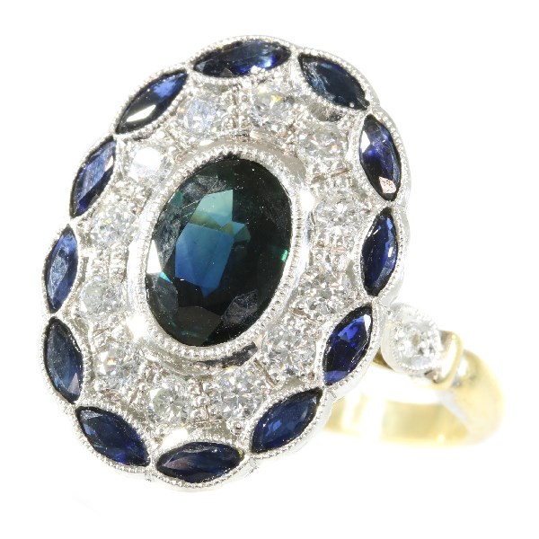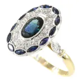 This Art Deco-inspired engagement ring, crafted in the 1950s, is more than a symbol of commitment; it's a beacon of romance, joy, and a promise of becoming a cherished future heirloom. Its Belgian origins and 18K bi-color gold setting frame the story of two intertwining lives, with diamonds and sapphires symbolizing enduring love. The joy it brings extends beyond the moment of proposal, encompassing all the happy memories and milestones it will witness. As a future heirloom, it promises to carry these stories, emotions, and the legacy of love through generations, deepening in value and sentiment with time.