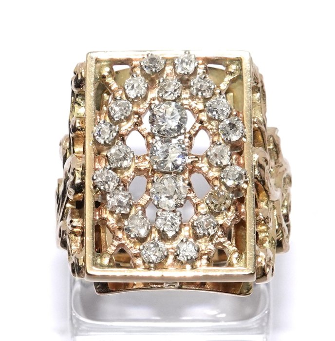 Degelijk vervaardigde rijk gezette vintage ring in zegelring design. De brede ringschouders, versierd met opengewerkte details, gaan over in de rechthoekige ringkop. Het bezette centrale deel van het hoofd is gevormd uit filigraan gouden ornamenten. De stenen zijn gerangschikt met een middenrij (3 x 0,18 ct.) en een ovale entourage (20 x 0,05 ct.). Handwerk in de beste staat.