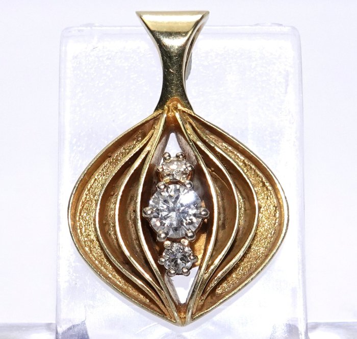 Vintage bloemenhanger in 585/14K geel goud. De ovale hanger met een stevig bevestigd oog is ontworpen als een bloem met vier lagen bladeren. De bladeren openen naar het midden en geven ruimte voor een rij van 3 diamanten met een vergrote middensteen. Bijzonder fijn bewerkte hanger met hoogwaardige stenen. Beste staat.
