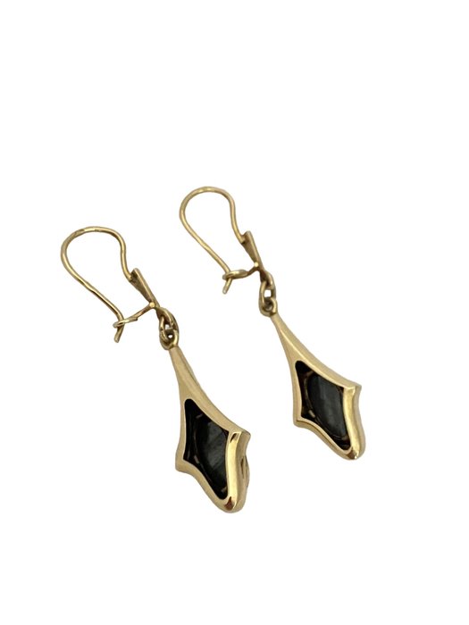 De hanger is gemonteerd aan een gouden oorhaak waarop een driehoekige versiering.