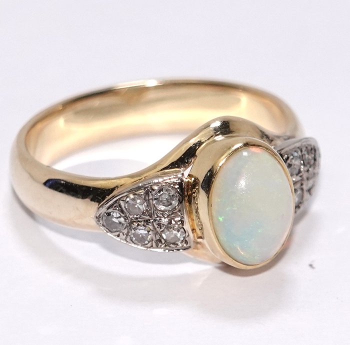 Vintage opaalring in 585/14K geelgoud. De ringkop is gezet met een ovale Australische massieve opaal cabochon van 0,70 ct. bezet. Aan de zijkanten nestelen zich driehoekige velden met 2 x 5 diamanten tegen het centrale frame. Heel goede staat.