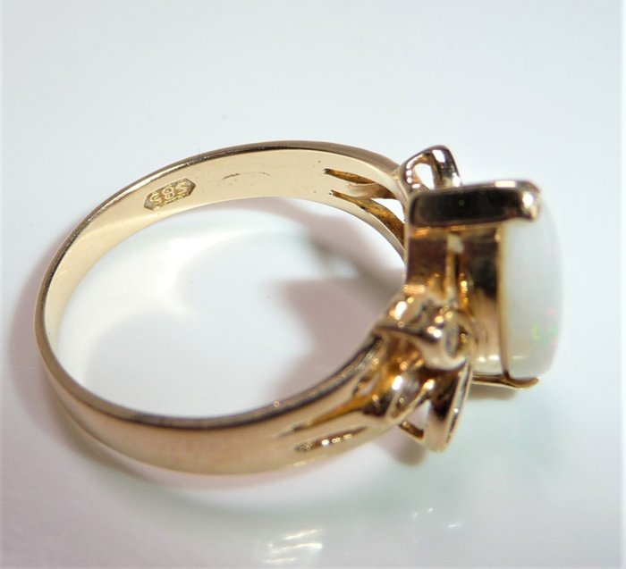 Ring van 585/14 kt geelgoud. De ring heeft een marquise vormige massieve Australische opaal erin gezet. De melkopaal is 1,20 ct. en verbergt tal van verschillende kleuren onder het oppervlak, zoals groen, blauw, geel en veel delen van het zeldzame rood.De kleuren komen vooral tot uiting bij het bewegen. In de overgang naar de ringband zitten 3 blaadjes bladgoud waarin elk een briljant geslepen diamant is gezet. De 6 diamanten zijn in totaal ca. 0,16 ct. (H/SI).