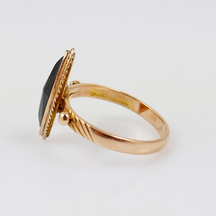 Een 14k rosé gouden ring met een marquise geslepen donkere granaat. De granaat is ca. 6 x 18 mm en rust op een gouden plateau, de rode kleur zie je daardoor alleen bij draaiing in het licht.