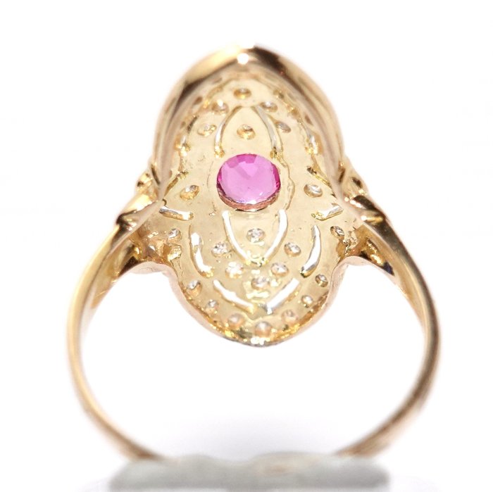 Vintage navette ring in 585/14K geelgoud en witgoud. De navettevormige ringkop is bezet met een robijn van 0,25 ct. bezet in het centrum. De hoofdsteen is omgeven door 32 achthoekig geslepen diamanten. Uitstekende staat.