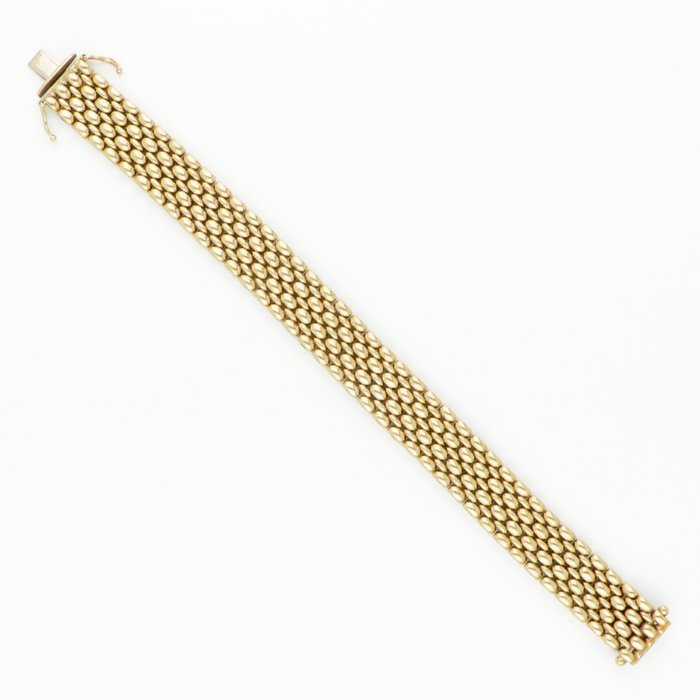 Geelgouden schakelarmband voorzien van een bakslot met 2 veiligheidsachtjes.