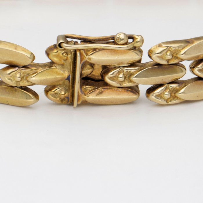 14 karaat geelgouden schakelarmband voorzien van een schakelbreedte van ca. 9 mm. De schakels zijn voorzien van gegrafeerde details.