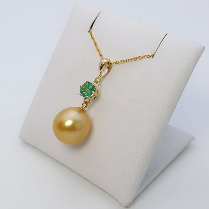 Elegante hanger gemaakt in combinatie van zoutwater hoogwaardige parel Gouden Zuidzee, smaragd en gouden componenten 14K.