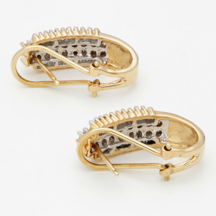 14 Karaat geelgouden oorbellen ieder bezet met 18 briljant geslepen diamanten van totaal ca. 0.54 en 11 baquette geslepen diamanten van totaal ca. 0.26 ct. . De diamanten zijn gezet in een witgouden chatonzetting. De oorbellen zijn voorzien van een tijdloos design.