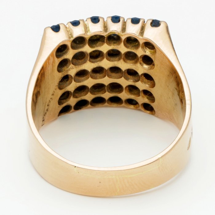 Geelgouden ring bezet met 30 rond gefacetteerde synthetische spinellen van totaal ca. 1.80 ct. De synthetische spinellen zijn gezet in open zettingen.