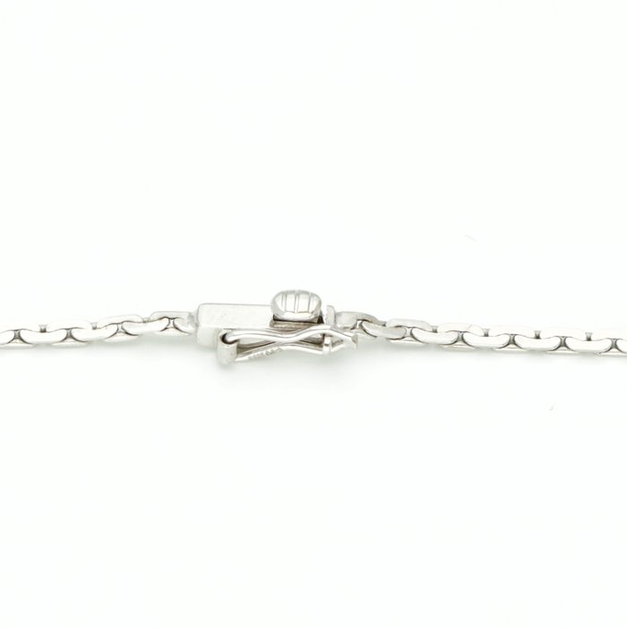 Witgouden vintage schakelcollier met middenstuk welke bezet is met een single cut diamant van ca. 0.01 ct. Het collier is voorzien van een bakslot met veiligheidsachtje. Het middenstuk is voorzien van opengewerkte, flexibele en een deels gematteerde bewerking. Het collier is vormgegeven in een tijdloos design.