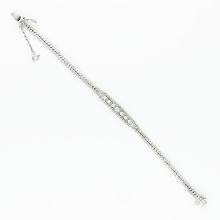 Witgouden schakelarmband bezet met 7 briljant geslepen diamanten van totaal ca. 0.27 ct. De diamanten zijn gezet in chaton zettingen. De schakelarmband is voorzien van een bakslot met een veiligheidsachtje en een veiligheidskettinkje.