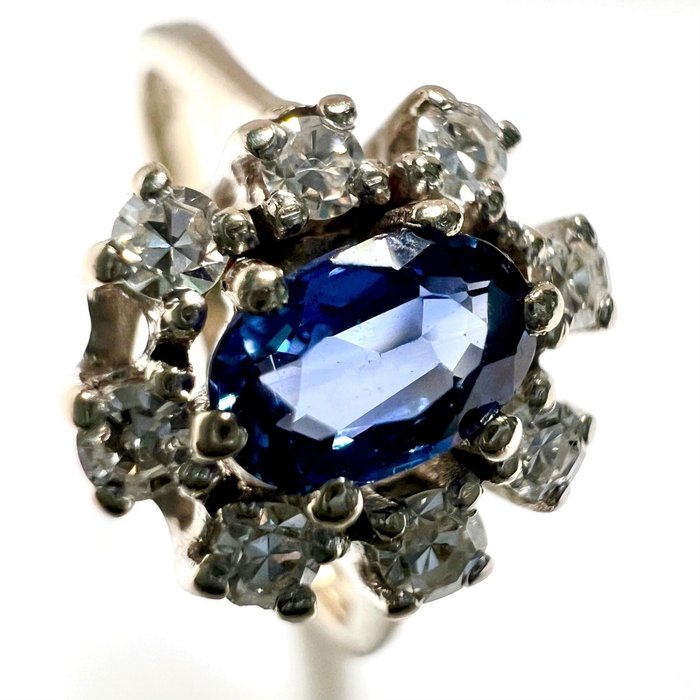 Ring van 585/14 kt witgoud. De ring heeft een klassieke vorm, met de ringkop in de vorm van een bloem. In het midden bevindt zich een ovale saffier van 6 x 4 x 2,3 mm, overeenkomend met ca. 0,45 ct. In totaal 8 achthoekig geslepen diamanten van in totaal 0,24 ct. (G/VS) omcirkel de saffier.