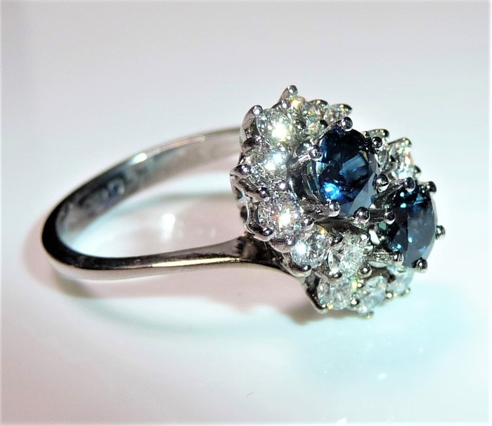Exclusieve ring in 585 / 14 kt witgoud. De ring is met de hand gemaakt. In de ringkop zijn twee edelsteenbloesems diagonaal naast elkaar gezet. In het midden bevindt zich een ronde, gefacetteerde saffier. De twee saffieren worden omlijst door in totaal 14 even grote briljant geslepen diamanten (F/VS-VVS). De karaatnummers van de edelstenen zijn gegraveerd op de ringband.