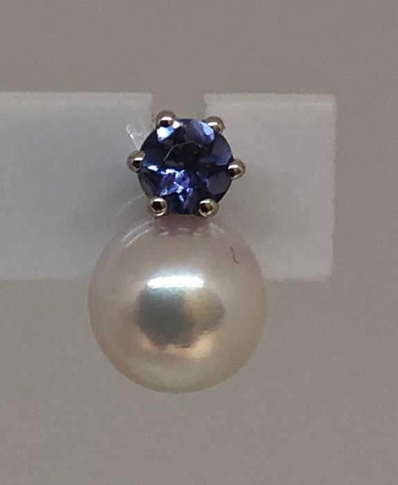 Prachtig paar oorbellen met mooie lichtblauwe Ioliet semi-préciputs steen & ronde Akoya Parels - Maat 7.5x8mm