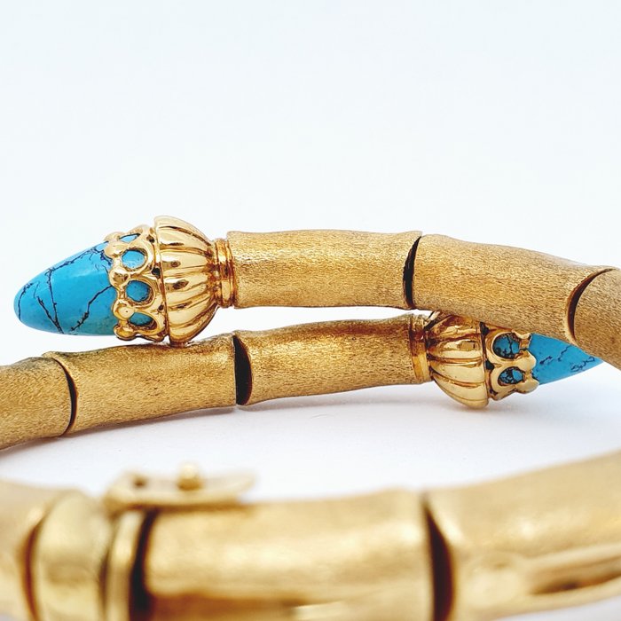 Halfstijve armband, zoals bamboe, 18k geel goud, met veiligheidsketting, aan de uiteinden bekroond door conisch gevormde gereconstitueerde turkooizen stenen.