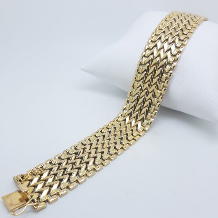 Volledig gemaakt van 18 kt geelgoud en heeft een karakteristiek zigzagpatroon.