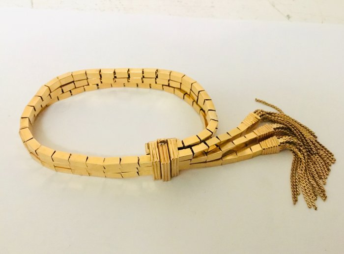 Fantastische vintage armband, uit de jaren 70, in 18K goud met een ontwerp van 3 samengevoegde, massieve kettingen, afgewerkt met franjes. Een uniek stuk met een spectaculair design, met een dubbele veiligheidssluiting.