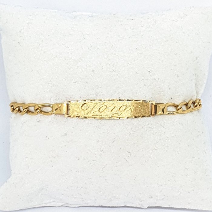 Armband gegraveerd met de naam 'Jorge' en een datum. Deze kan kosteloos worden gewist.