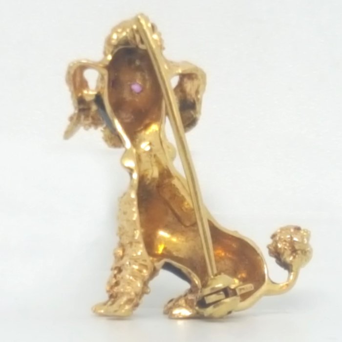 Poedelhond broche, met zwarte emaille jersey en 2 robijnen als ogen van 1.5mm briljant geslepen en totaal gewicht ca. 0,03 ct.