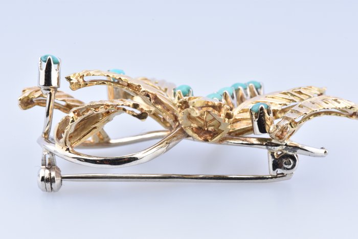 Schitterende broche in 18 karaat geelgoud (750/1000) in de vorm van een blad versierd met 9 ronde turkooizen. Veilige naaldsluiting.