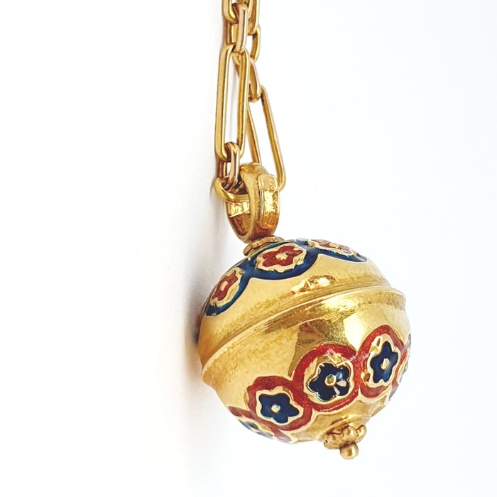 Bol hanger met ketting, geheel 18k goud. versierd met emaille