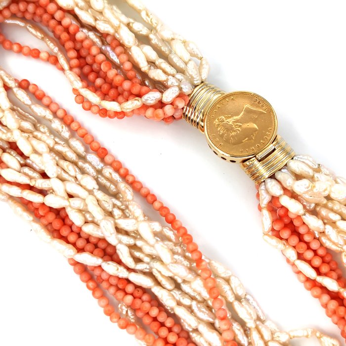 Collier van scaramazza parels en roze koraal met 18 karaats geelgouden sluiting (circa 15 gram) met sterling gezet uit 1863 victoria dei gratia