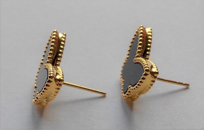 Magische 750 / 18 kt geelgouden oorbellen in de vorm van vlinders, elk bezet met een onyx plaatje.