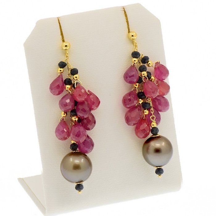 18k / 750 geelgouden oorbellen met Tahiti parels en gekleurde saffieren.