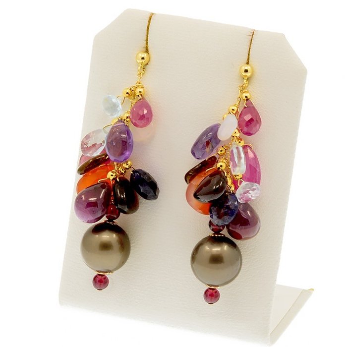 18k / 750 geelgouden oorbellen met Tahiti parels, gekleurde saffieren, opaal, topaas, rhodoliet, amethist, ioliet, toermalijn, carneool en robijn,