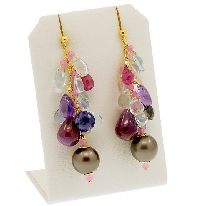 18k / 750 geelgouden oorbellen met Tahiti parels, amethist, roze saffier, robijn, blauwe topaas, roze topaas en ioliet.