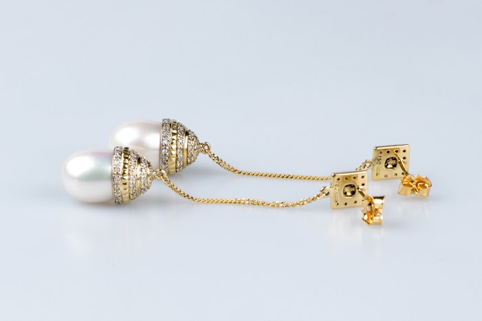 18 karaat geelgouden oorbellen versierd met 2 parels en 132 ronde briljant diamanten van elk 0,01 karaat, ofwel 1,32 karaat in totaal.