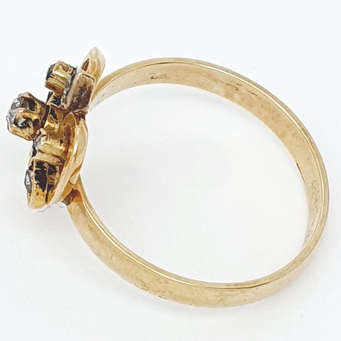 Gouden cocktailring met opengewerkte plantmotieven en hartvormige motieven versierd met 2 schitterende oud geslepen diamanten, 16/16 van 2 mm en 2,8 mm en 5 van 1,7 mm en roosgeslepen, met een gewicht van ca. Totaal 0,14 ct.