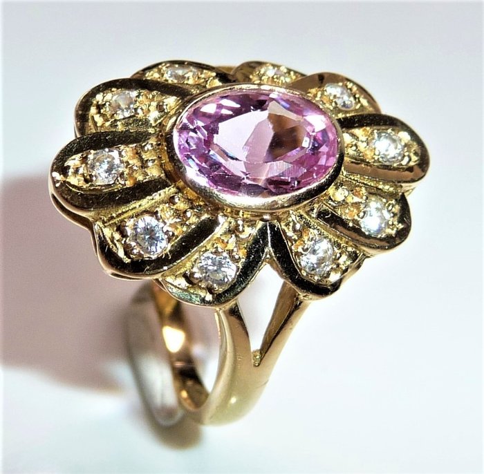 Ring van 750/18K geelgoud. De ring heeft een ovale ringkop, die is bewerkt als een bloem. In het midden bevindt zich een bijna oogschone roze saffier van 1,75 ct. met de afmetingen 6 x 6,5 x 4,2 mm. Fijn delicaat roze en een heldere transparantie. In totaal 10 bloemblaadjes omringen de saffier en hebben in totaal 20 briljant geslepen diamanten van in totaal 0,20 ct. (F/VS-VVS) geslepen.