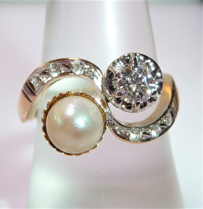 Antieke ring in 18 kt / 750 goud. De ringrail beschrijft een S-bocht in het bovenste gedeelte. In de putjes is een Akoya-parel gezet en er tegenover een briljant geslepen diamant van 0,27 ct. met de afmetingen 4,2 x 4,1 mm diameter en 2,5 mm diepte. De grote diamant heeft een zeer goede zuiverheid met VVS en de kleur is puur wit G-F. Het golvende frame laat de diamant nog groter lijken. De ringschouders zijn nog bezet met witte spinellen van in totaal 0,10 ct. bezet.