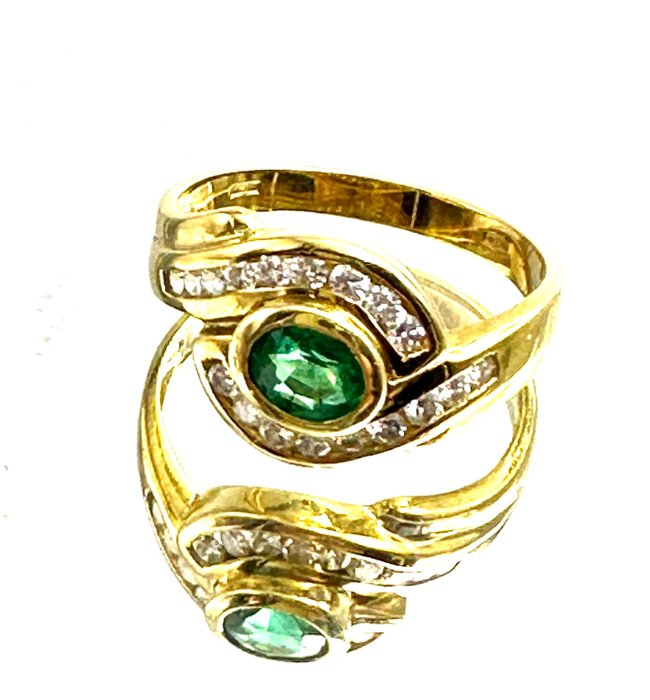 Elegante contrariè in geelgoud met diamanten (18 x 0,03 ct) en schitterende groene smaragd (0,30 ct) van uitstekende zuiverheid.