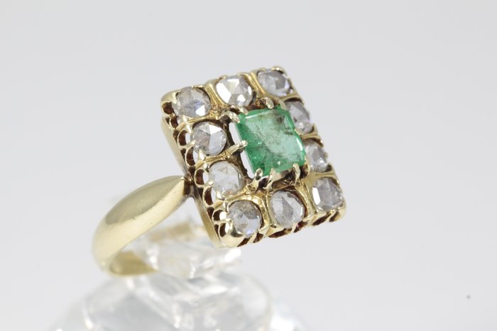 Ring in 18kt goud, getest met speciale zuren door een professional, uit de jaren '40 - '50. Aan de bovenkant is een vierkant geslepen smaragd van ct. 0,50, ongeveer, omgeven door 10 diamanten rozen. De ring verkeert in uitstekende staat, gezien de leeftijd heeft hij een totaal gewicht van gr. 4.3, de maat is 13 - 53, de kop van de ring meet mm. 14,0 x 12,0, ca. Verzending naar Italië en Europa is voor onze rekening, de rest van de wereld 50 euro, altijd met traceerbaarheid. Kopers buiten de EEG dienen rekening te houden met douanerechten.