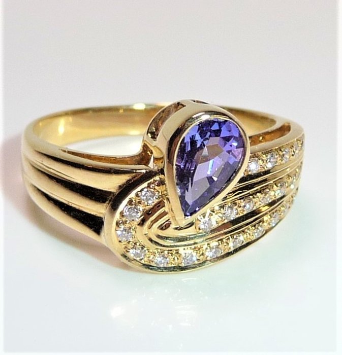 Ring van 750/18 kt geelgoud. De platte bandring heeft een gefacetteerde tanzaniet van 0,50 ct. gescherpt in peer gesneden. De tanzaniet heeft een intense paarsblauwe kleur. De traan steekt zijdelings uit voorbij de ringband en trekt zo de aandacht naar zich toe. De ringband is gezet in drie rijen met in totaal 24 briljant geslepen diamanten van in totaal 0,30 ct.